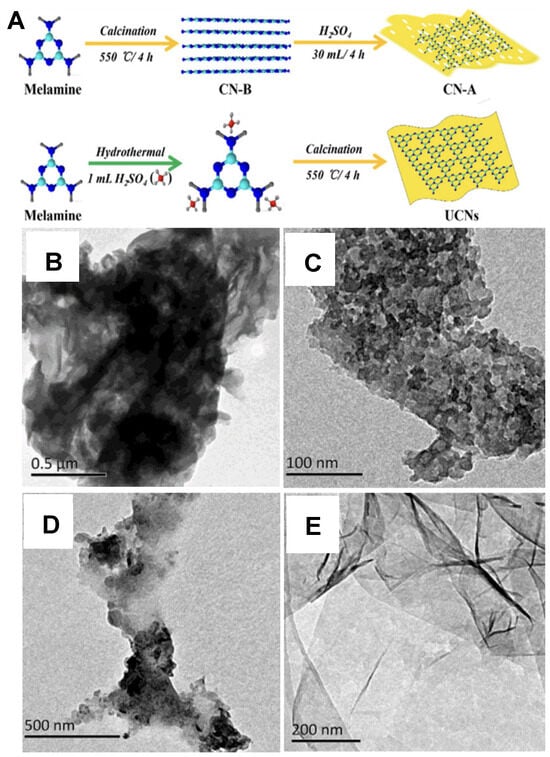 (A) Synthesis Procedure of Nanosheets of CN; TEM images of (B) bulk CN; (C) acid-treated CN; (D) hydrothermal treatment of melamine without acid and (E) Ultrathin CN nanosheets []. Reprinted with permission from Ref. [].