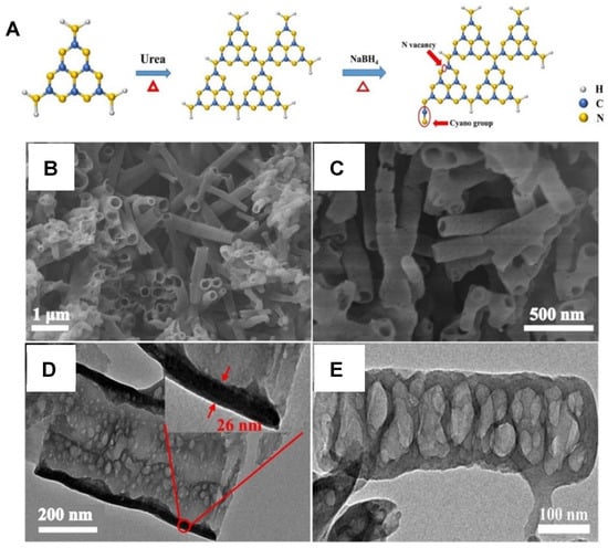 Guo et al. used hexagonal rod-shaped single-crystal supramolecules as precursors to prepare hexagonal P-doped CN nanotubes with a layered structure. Experimental results show that compared with ordinary CN, hexagonal CN nanotubes have more active sites and their specific surface area is significantly increased. At the same time, due to the doping of P, the band gap becomes narrower, the conductivity is improved, and the hydrogen evolution efficiency has also increased []. Liu et al. heated a mixture of NaH2PO4·H2O and melamine at a high temperature and achieved large-scale rapid synthesis of P-doped CN nanotubes. During the synthesis process, NaH2PO4·H2O generates phosphine gas at high temperatures, which induces the transformation of CN from 2D nanosheets to 1D nanotubes []. Li et al. prepared modified CN nanotubes by a two-step hydrothermal-thermal polycondensation method using a combination system of urea and melamine as precursors. The experiments show that controlling the reaction temperature can effectively adjust the vacancy concentration on the nanotubes, and a larger vacancy concentration is conducive to capturing photogenerated electrons. In addition, the tubular structure makes the transmission path of electrons from the bulk phase to the surface phase shorter, and the photocatalytic activity is greatly improved []. Before preparing CN nanotubes, Zhang et al. first placed melamine in a NaOH aqueous solution for hydrothermal pretreatment, then calcined the pretreated product, and finally obtained CN nanotubes. The studies show that the production of CN nanotubes is attributed to the hydrothermal pretreatment process because cyanuric acid is generated in this process, which will form a supramolecular precursor through self-assembly with melamine. The precursor can be calcined to form CN nanotubes, which have excellent photocatalytic hydrogen evolution properties []. Guo et al. prepared CN nanotubes with abundant nitrogen-vacancy defects by a simple sodium borohydride thermal reduction method. As shown in Figure 2A, a mixture of melamine and urea was first calcined under an inert gas N2 to prepare CN nanotubes, which were then mixed with sodium borohydride and further calcined under N2 to obtain defect-rich porous CN nanotubes. As shown in Figure 2B–E, Scanning Electron Microscope (SEM) and transmission Electron Microscope (TEM) images show that the porous CN nanotubes have a uniformly distributed porous hollow tubular structure with a diameter of about 200 nm and a wall thickness of about 26 nm. The porous hollow structure can provide abundant surface active sites, which is beneficial to improving the photocatalytic performance [].