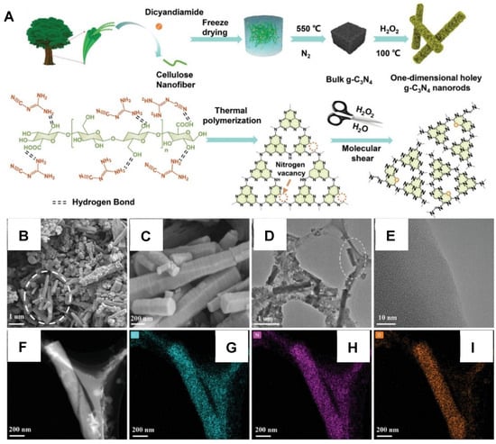 Preeyanghaa et al. used melamine and HONH2.HCl complex as templates to synthesize hierarchical CN nanorods with carbon vacancies by ultrasonic-assisted thermal polycondensation. The nanorods can promote light scattering, have a large specific surface area and active sites, and provide abundant transport channels for charge migration. In addition, the presence of carbon vacancies can also serve as shallow charge capture centers and promote charge separation []. Zou et al. can universally prepare 1D porous CN nanorods containing nitrogen vacancies and oxygen doping with a variety of nitrogen-containing precursors through the hydrogen bonding structure and molecular shearing effect of “nitrogen-containing precursor-nanocellulose”. As shown in Figure 3A, the preparation process of CN-based photocatalyst mainly includes the hydrogen bonding between dicyandiamide and the functional groups of nanocellulose-hydroxyl and carboxyl groups, and the subsequent thermal polymerization and H2O2 molecular shearing process. The morphology of CN nanorods is shown in Figure 3B–I, in the preparation process of the above catalyst, nanocellulose plays the role of soft template and dopant at the same time. Therefore, nitrogen vacancies and oxygen doping were successfully introduced into the molecular skeleton of CN. Under the molecular shearing action of H2O2, CN was converted into one-dimensional nanorods, and the nanorods were filled with nanosheet frameworks. The 1D nanorod-like structure greatly increased the specific surface area of CN, exposed a large number of active sites, and enhanced the photocatalytic activity []. Liang et al. first heated melamine in the crucible at 500 °C for 4 h, and then put it in a tube furnace with KCl and LiCl, heated at 550 °C in the N2 atmosphere for 4 h. The obtained products were washed with boiling water. Finally, after drying at 60 °C for one night, CN nanorods were obtained. Subsequently, W-doped highly crystalline CN nanorods catalysts were successfully prepared by a solvothermal-assisted W-doping method for photocatalytic CO2 reduction [].