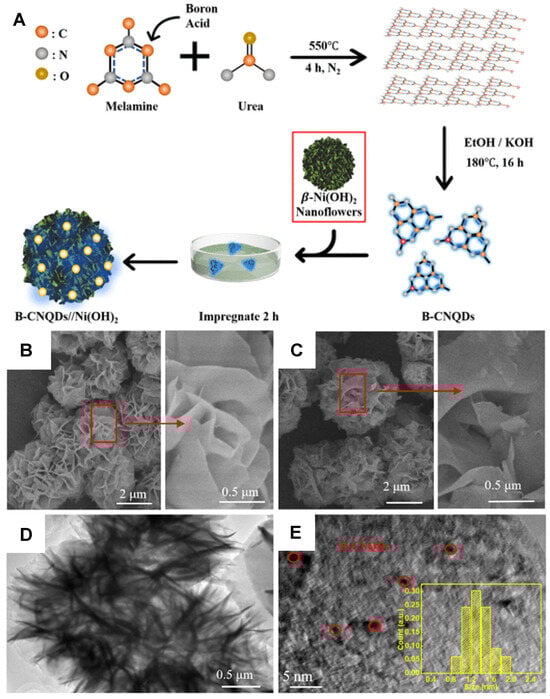 (A) Diagram illustration for the synthesis of B-CNQDX-Ni nanoflowers; (B) SEM images of Ni(OH)2 nanoflowers; (C) SEM images of B-CNQD10-Ni nanocomposites, and (D) TEM and (E) HRTEM images of B-CNQD10-Ni nanocomposites []. Reprinted with permission from Ref. [].