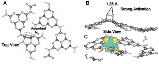 (A) N2 adsorption geometry on polymeric carbon nitride with nitrogen vacancy; (B) and (C) The charge density difference of the N2-adsorbed polymeric carbon nitride with nitrogen vacancy; the yellow and blue isosurfaces represent charge accumulation and depletion in the space, respectively []. Reprinted with permission from Ref. [].