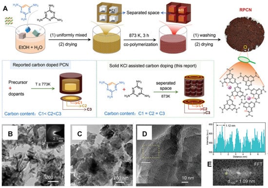 (A) Schematic illustration of salt-template-induced homogeneous incorporation strategy; TEM images of (B) polymeric carbon nitride, (C,D) red polymeric carbon nitride; (E) The Fast Fourier Transform (FFT) pattern of red polymeric CN corresponding to the yellow framework of (D) []. Reprinted with permission from Ref. [].