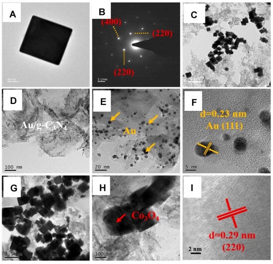 (A) TEM photograph and (B) SAED pattern of Co3O4; TEM photographs of (C) CN/Co3O4, (D–F) Au/CN, and (G,H) 4Au/CN/Co3O4. (I) High-resolution TEM photograph of 4Au/CN/Co3O4 []. Reprinted with permission from Ref. [].