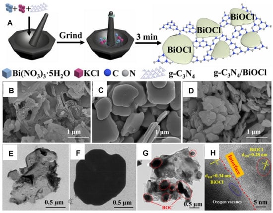 - Hou, J.; Wang, H.; Qin, R.; Zhang, Q.; Wu, D.; Hou, Z.; Yang, W.; Hussain, A.; Tahir, M.; Yin, W.; et al. Grinding preparation of 2D/2D g-C3N4/BiOCl with oxygen vacancy heterostructure for improved visible-light-driven photocatalysis. Carbon Res. 2024, 3, 1. [Google Scholar] [CrossRef]