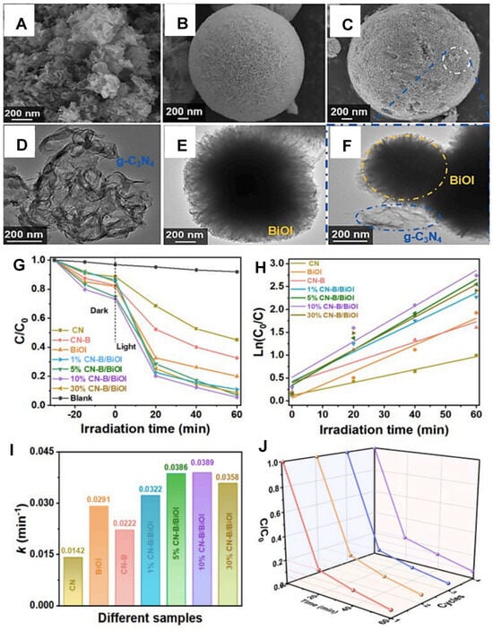 SEM images of (A) CN-B, (B) BiOI, and (C) 10% CN-B/BiOI composite; TEM images of (D) CN-B, (E) BiOI, and (F) 10% CN-B/BiOI composite; (G) Photocatalytic TC degradation curves of the as-prepared photocatalysts in simulated seawater. (H) Pseudo-first-order degradation kinetics curves and (I) corresponding degradation rate constants of the prepared samples. (J) Photocatalytic TC degradation stability tests of 10% CN-B/BiOI sample []. Reprinted with permission from Ref. [].