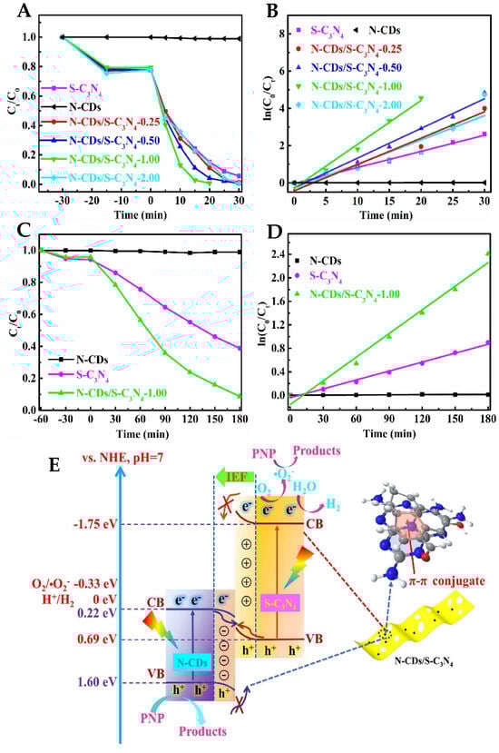 Photodegradation of RhB under visible-light irradiation (A) and corresponding first-order plots (B); Photodegradation of PNP under visible-light irradiation (C) and corresponding first-order plots (D); (E) Photocatalytic mechanism of N-CDs/S-CN S-scheme heterojunction []. Reprinted with permission from Ref. [].