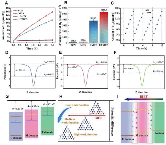 (A) The photocatalytic hydrogen production over 3 h and (B) the corresponding hydrogen evolution rate of BCN, MCN, UMCN and UTMCN; (C) Stability evaluation of photocatalytic hydrogen production for UTMCN; The theory work function of (D) U domain, (E) M domain and (F) T domain; (G–I) The built-in electric field (BIEF) formation by U domain, M domain and T domain []. Reprinted with permission from Ref. [].