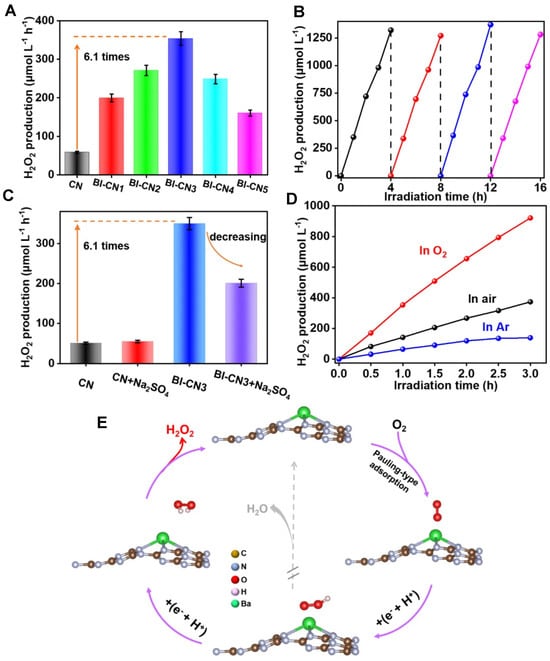(A) Photocatalytic H2O2 generation rates of different samples; (B) Cyclic H2O2 generation test of the BI-CN3 photocatalyst; (C) Photocatalytic H2O2 activity of bulk CN and BI-CN3 samples in 0.1 mol·L−1 Na2SO4 solution; (D) H2O2 evolution activity of BI-CN3 samples under different conditions; (E) Mechanism of highly selective photocatalytic synthesis of H2O2 via the 2e−ORR pathway by in-plane highly ordered CN nanorods with Ba implantation []. Reprinted with permission from Ref. [].