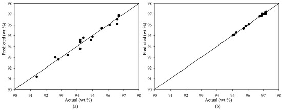 For the homogeneous transesterification reaction, the quadratic term β4M22 exhibited the highest level of significance among the coefficients. Following closely, the coefficient β1M2 emerged as the second most significant, as evidenced by its low p-values in the correlation prediction model. This finding indicates that methanol content plays an important role in influencing the generation of ME purity. The terms β2C2 and β7C22 represented the influence of KOH concentration, ranking third and fourth, respectively. The term with the lowest level of statistical significance in the analysis was identified as β3T2. Hence, it can be inferred that the reaction time observed in the homogenous-base-catalyzed reaction emerged as the lowest prominent independent variable. The ANOVA was used to fit a quadratic response surface model with the least squares method and evaluate the goodness of the fit to the collected data. The assessment of the model’s fit to the experimental data was conducted at a confidence level of 95%, as represented in Table 4. The calculated F-value from the model (F0) must be greater than the critical value (Fcritical) when the F-test is utilized to remove the null hypothesis of each model. In both the heterogeneous and homogeneous-base-catalyzed reactions, the F0 values were found to be greater than the Fcritical values. Furthermore, the number of experiments conducted was adequate to examine the impact of the variable factors on the production of higher-purity ME. Therefore, it is reasonable to assume that qualified ME can be produced in pretreated esterified oil via heterogeneous and homogeneous-base-catalyzed reactions using a batch process, as predicted by all the fitted models. The correlation between the ME purities anticipated by the empirical model and those acquired from practical experiments employing both heterogeneous and homogeneous catalytic processes is illustrated in Figure 2. In addition, the accuracy of the prediction models was evaluated utilizing the adjusted determination coefficient (R2adjusted) and the determination coefficient (R2). The R2adjusted for the heterogeneous and homogeneous catalytic reactions was 0.956 and 0.990, respectively, while the R2 was 0.976 and 0.995, respectively. Both coefficients having significant values confirm the model’s high significance and indicate a strong correlation between the independent and dependent variables. Table 2 demonstrates a high level of concordance between the predicted and actual results of ME purities. Therefore, these statistical tests showed that the selected models can accurately predict the ME results across all of the experimental variable analyses.