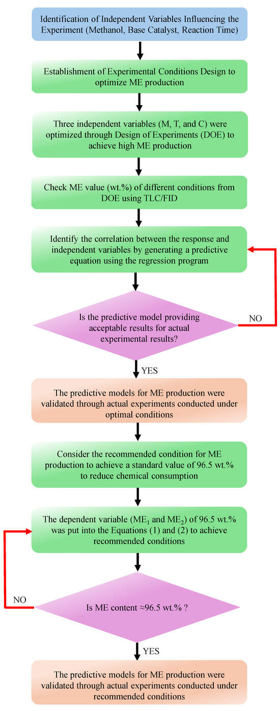 The experimental results of the base-catalyzed transesterification processes, both heterogeneous and homogeneous, were examined using the RSM to optimize the parameters for producing ME from PSPO. The CCD was used to carry out the RSM experiment, which included three levels: –1, 0, and +1, which were used to vary the values of the independent variable throughout the optimized process within the confines of the CCD. Three independent variables were adjusted in order to conduct the experiments. For the heterogeneous transesterification process, important independent variables (CaO catalyst loading (10–60 wt.%), methanol concentration (25–65 wt.%), and reaction time (60–180 min)) were varied. For the homogenous transesterification process, KOH catalyst loading (1–3 wt.%), methanol concentration (1.8–5.5 wt.%), and reaction time (20–60 min) were examined. In the present study, the three different independent variables were calculated using a general second-order polynomial equation (Equation (3)). For each variable, Table 7 shows the values that are within the coded factor level ranges. The flowchart of the methodology of this study using the RSM optimization method is shown in Figure 4.