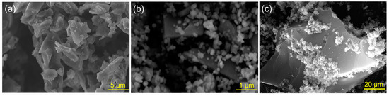 The SEM images of biochar (a), rutile (b) and Rut-Bio (c).