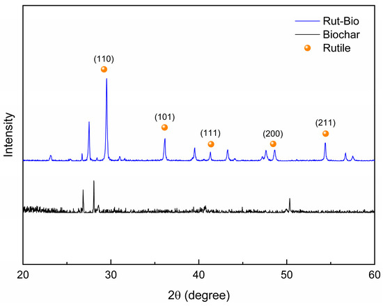 The biochar and Rut-Bio composites were subjected to XRD analysis. The XRD spectrum of the biochar exhibited three broad and gradual amorphous diffraction peaks, accompanied by several sharp and distinct minor diffraction peaks, indicating the carbonization process of the biochar (Figure 2). The crystalline compound undergoes carbonization, resulting in the formation of microcrystalline carbon with a finely graphitized particle structure. The characteristic peaks of carbon complexes appear at 26.35° and 28.24°. Following high-temperature carbonization, there is minimal alteration observed in the biochar’s structure within Rut-Bio, thereby leading to negligible changes in diffraction peaks. The peaks observed at 29.63°, 36.14°, 41.82°, 48.77°, and 54.61° in the XRD pattern of the Rut-Bio composite correspond to five characteristic diffraction planes of rutile TiO2, specifically (110), (101), (111), (200), and (211). The structural integrity and stability of Biochar–Rutile composites are very significant.