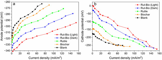 In order to further examine the effects of Rut-Bio cathode material and visible light on the electrode potential of the MFC system, variations in external circuit resistance were utilized to generate electrode potential curves for both the anode and cathode within the experimental setup. The anodic potential curve of Rut-Bio (Light) demonstrates a lower slope in comparison to other systems, indicating the ability of the anode to maintain a reduced potential over an extended duration (Figure 5a). Furthermore, the initial anode potential of Rut-Bio (Light) (−344 mV) is notably lower than that observed in other systems. In summary, the Rut-Bio cathode-catalysed MFC system consistently maintains a high potential with low polarization, and the anode exhibits strong electron transfer capability. Moreover, the cathode potential curve illustrates that the initial cathode potential of Rut-Bio (Light) reaches up to 1.2 mV (Figure 5b). The cathode potential curve slope of the Rut-Bio (Light) system is notably the lowest, indicating a low polarizability and excellent electron acceptance ability. The results demonstrate that utilizing the Rut-Bio composite as a cathode photocatalyst effectively increases the electrode potential difference in MFC, thereby enhancing its electron transfer rate. A higher electron transfer rate also facilitates redox reactions [60].