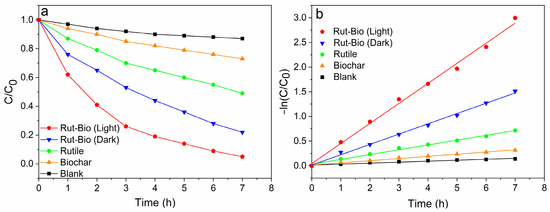 The electricity generation performance of MFCs has been demonstrated to exhibit a positive correlation with its efficiency in degrading pollutants [36]. In previous studies, it has been confirmed that Rut-Bio composite materials demonstrate a significant improvement in the degradation efficiency of heavy metal pollutants, and have great potential in the application of environmental pollution control. With the significant improvement of MFC power generation capacity by Rut-Bio (Light), we chose Cr6+ as indicators to evaluate heavy metal pollution and conducted in-depth research on the specific impact of Rut-Bio (Light) on the treatment effect of heavy metal pollution in order to further optimize the application of Rut-Bio composite materials in the field of environmental remediation. Under uniform experimental conditions, the degradation experiment was replicated three times to mitigate potential errors and sporadic factors. Figure 6a illustrates the degradation curves of Cr6+ using different MFCs, with an initial concentration of the Cr6+ solution set at 80 mg/L. After the experiment lasted for 7 h, the degradation efficiency of the Rut-Bio (Light) system reached 95%, which was 21.8% higher than the Rut-Bio (Dark) system with a removal rate of 78%. The degradation efficiency of rutile and biochar reached 51% and 27%, respectively. Compared to the 13% of the blank group, the degradation efficiency of the other three MFCs increased by 500%, 292.3%, and 107.7%, respectively. Obviously, the Rut-Bio composite material significantly improves the degradation efficiency of MFCs towards Cr6+, and has the best effect in all four MFCs, while its degradation effect is even stronger under light conditions.