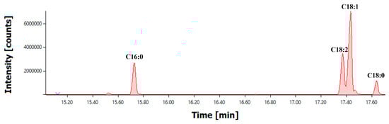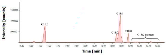 Table 3 shows the product composition of BD1 after hydrogenation using catalysts C1-Co, C2-Ni, C3-Pd, C4-Co, C5-Ni, and C6-Pd. The hydrogenation reactions were carried out under reaction conditions established for the hydrogenation of methyl linoleate. The temperature was increased to 140 °C for a reaction time of 3 h for improved hydrogenation of several unsaturated components in the biodiesel samples. Entries 1–3 show the catalytic performances of catalysts C1-Co, C2-Ni, and C3-Pd, with the three catalysts having converted all the C18:1 and C18:2 to C18:0 components, which correlates well with the observations in Table 2. Entries 4–6 show that <90% of C18:1 and C18:2 in BD1 is converted to the C18:0 component using catalysts C4-Co, C5-Ni, and C6-Pd. In this study (Table 3 entry 7a), reducing the reaction time to 3 h improves the percentage of C18:1 in the mixture. From entry 7, the amount of C16:0 is expected to remain constant at approximately 13%, as the component does not contain any C=C that can be further converted to a product. The C16:0 and C18:0 components do not undergo oxidation reactions as they do not have C=C bonds and they do not contribute directly to the oxidative stability of a biodiesel sample, although they do affect the viscosity of the samples. The oil sample isolated at this entry (hereafter referred to as H-BD1) has the following composition: 23.4%, 8.1%, 49.2%, and 18.2% of C16:0, C18:2, C18:1, and C18:0, respectively. After hydrogenation, new peaks of compounds with m/z of 294 (2.1%) were observed at retention times between 19.1 and 19.5 min (Figure 5), which are suggested to be isomers of the C18:2 chain, as they were not observed before hydrogenating the sample. The mass fragments for the observed compounds are shown in Figure S13. The trans-isomerism of the C=C bonds in fatty acid methyl esters during hydrogenation has also been reported to be common in the Pd- and Ni-catalyzed reactions [7].