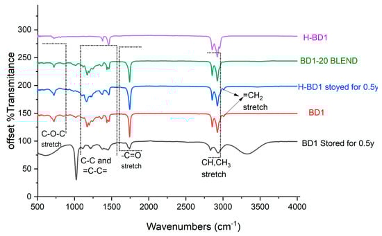 The biodiesel samples BD1, H-BD1, BD1:LP5 blend, and BD1-BL (labeled BD1–20 in the staggered IR spectra) were analyzed using IR spectroscopy to determine the changes in the functional groups before and after 6 months of storage. These were compared to the IR of conventional LP5 diesel (Figure S17). The staggered IR spectra (Figure 9) show the CH stretches at 2853–305 cm−1, and the C=O stretch is observed at 1730 cm−1 in all the analyzed samples, which confirms the expected functionalities of these samples [12]. The peak at 720 cm−1 shows the presence of the C18:2/C18:1 cis-isomer in all the biodiesel samples, while the C-C stretches are observed at 1300–1440 cm−1 [11,12,30]. The partially hydrogenated sample (H-BD1) shows no major changes in the functional groups as expected, and even after storage for 6 months, the functional groups show no changes, indicating negligible or no oxidative reactions to cause changes in the functional groups of the biodiesel. However, the un-hydrogenated biodiesel sample after 6 months of storage (labeled BD1 stored 0.5 y in Figure 9) shows the significant onset of oxidation reactions leading to the appearance of a broad peak at 3490 cm−1, which corresponds to the presence of the OH moiety and could be due to the formation of either aldehydes, ketones, lactones, caproic, or propionic acids [13]. In addition, the presence of the C-O-O stretch at 1125 cm−1 shows that the auto-oxidative reactions have degraded the fuel within 6 months of storage [12,31].