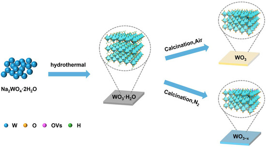 To generate WO3 samples lacking oxygen vacancies for comparison with WO3−x, the WO3·H2O precursor was calcined in an airtight environment under the same conditions used for preparing WO3-x.