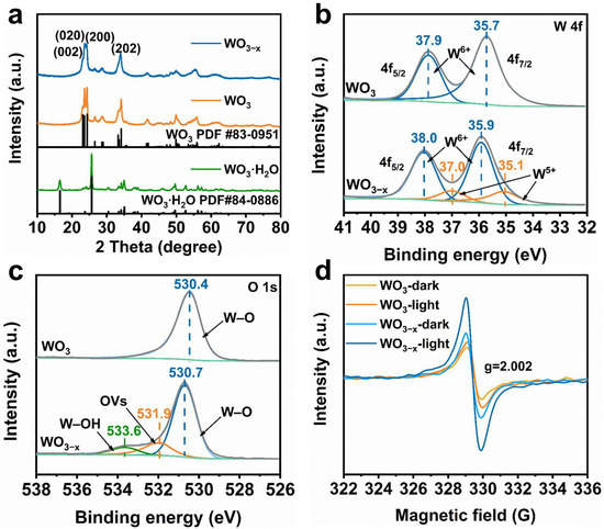 (a) XRD patterns of WO3 and WO3−x; (b) XPS analysis of W 4f; (c) XPS analysis of O 1s; (d) ESR spectra.