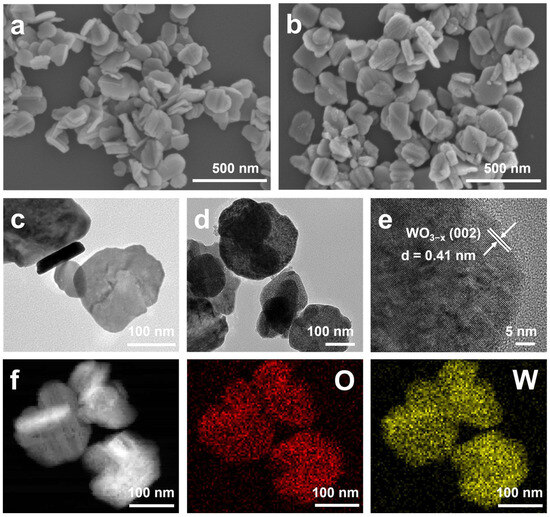 The structure of the prepared samples: (a) SEM images of WO3 and (b) WO3−x; (c) TEM of WO3 and (d) WO3−x; (e) HRTEM; and (f) Elemental mapping analysis of WO3−x.