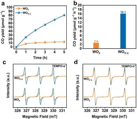 The photocatalytic performance of WO3 and WO3−x: (a) the amount of CO generated, (b) the rate of CO production; ESR spectra of WO3 and WO3−x under dark and light conditions: (c) e−, (d) h+.