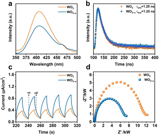 (a) Steady-state fluorescence spectra, (b) transient fluorescence spectra, (c) photocurrent response curves, and (d) EIS Nyquist plots for WO3 and WO3−x.