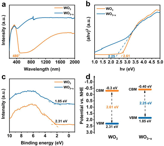 (a) UV-Vis-NIR diffuse reflectance spectra, (b) band gaps via Kubelka–Munk (K–M) jump, (c) valence band XPS spectra, and (d) band structures of WO3 and WO3−x.