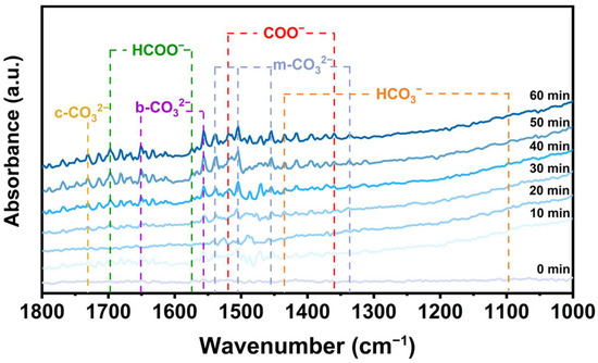 Measurements using in situ Fourier transform infrared spectroscopy (FTIR) are essential to reveal the formation and changes of intermediates during the reaction. Photocatalytic CO2 reduction over WO3−x nanosheets containing abundant oxygen defects was taken as an example. As shown in Figure 7, several peaks emerged in the IR spectra and gradually intensified as the time increased from 0 min to 60 min. Characteristic peaks belonging to monodentate carbonate (m-CO3−) were detected at 1539, 1503, 1455, and 1336 cm−1, and characteristic peaks belonging to bidentate carbonate (b-CO32−) were detected at 1651 and 1556 cm−1. The characteristic peaks of chelate-bridged carbonate (c-CO32−) at 1731 cm−1 and bicarbonate (HCO3−) detected at 1434 and 1095 cm−1 all originated from CO2 adsorption, highlighting the excellent CO2 uptake capacity of WO3−x [34]. COO− peaks at 1519 and 1360 cm−1 indicate that CO2 molecules can be well activated during the reaction. In addition, new peaks belonging to the HCOO− group were significantly observed at 1697 and 1574 cm−1, and their peak intensities increased markedly with increasing irradiation time, suggesting that the HCOO− group is a crucial intermediate in the CO2-to-CO photoreduction process [35]. Based on these analyses, it can be inferred that the photosynthesis of CO2 on WO3−x proceeds through the following pathways: First, CO2 molecules are adsorbed on the surface of the WO3−x catalyst. This process is one of the key steps in the photocatalytic reduction of the CO2 reaction; the adsorbed CO2 reacts with protons (H+) produced by hydrolysis to form COOH* intermediates. This step demonstrates the activation of CO2 on the catalyst surface; subsequently, the COOH intermediate is deprotonated to generate CO. Specifically, COOH reacts with H+ and electrons to generate CO while releasing water molecules (COOH* + H+ + e− → CO* + H2O); finally, CO is further decomposed to generate the final product CO (CO → * + CO). This process illustrates the transformation pathway from the intermediate to the final product. Together, these steps constitute the mechanism of carbon dioxide photosynthesis on WO3−x and enhance the activity and selectivity of the catalyst by introducing defective structures such as oxygen vacancies.