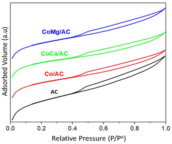 N2 adsorption/desorption isotherms at −196 °C with AC and Co-based catalysts.