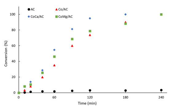 It can be seen that the catalytic activity of the activated carbon is negligible (Figure 3); between 0.2 and 3.5% guaiacol converted after 10 min and 240 min reactions. The non-promoted Co/AC catalysts showed an initial conversion (after 10 min) of guaiacol of ca. 3.3%, while the alkali-promoted catalysts showed higher values of ca. 7.7% and 8.1%, respectively, compared to the CoCa/AC and CoMg/AC catalysts. However, the Coca/AC catalyst showed a faster trend than the CoMg/AC catalysts, achieving 100% conversion after 180 min and 240 min, respectively. As reported elsewhere [19], despite the Mg-promoted catalysts being slightly more active under initial conditions, the CoCa/AC became more active, suggesting the formation of an active species—likely a mixture of CoO-CaO—along the reaction, in agreement with the differences and changes observed in the textural parameters, the XRD patterns, the TPR profiles, and CO consumption.