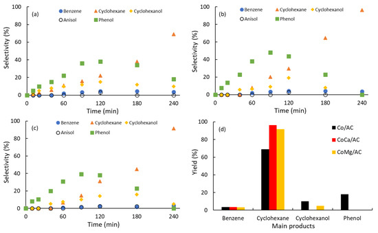 Figure 4a–c show the kinetics of the appearance and disappearance of the main products detected during the conversion of guaiacol for the Co/AC, CoCa/AC, and CoMg/AC catalysts, respectively. Figure 4d shows the yields of the main products after 240 min. The selectivity trends observed in Figure 4 suggest that guaiacol conversion seems to follow parallel reactions.