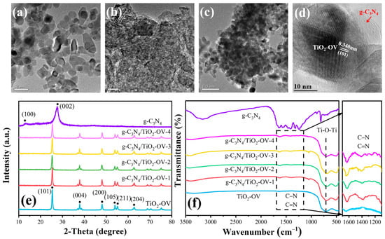 TEM images of (a) TiO2-OV, (b) g-C3N4, and (c) g-C3N4/TiO2-OV-2 composites, (d) HR-TEM image of g-C3N4/TiO2-OV-2 composite, (e) XRD patterns and (f) FT-IR spectra of TiO2-OV, g-C3N4, and g-C3N4/TiO2-OV samples with different contents of g-C3N4.