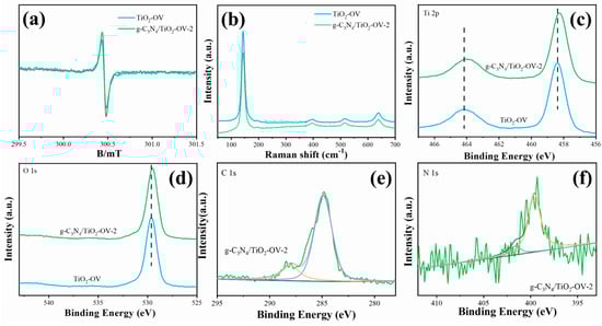(a) Low-temperature EPR spectra, (b) Raman spectra, (c) Ti 2p, (d) O 1s, (e) C 1s, and (f) N 1s high-resolution XPS spectra of TiO2-OV and g-C3N4/TiO2-OV-2 samples.