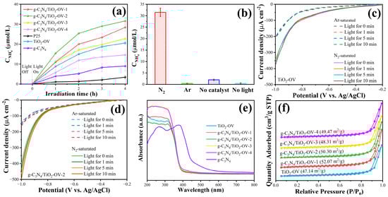 (a) Photocatalytic N2 fixation activity of P25, TiO2-OV, and g-C3N4/TiO2-OV materials, (b) photocatalytic N2 fixation activity in the presence of g-C3N4/TiO2-OV-2 with controlled conditions, linear sweep voltammogram curves in N2 and Ar atmosphere of (c) TiO2-OV and (d) g-C3N4/TiO2-OV-2 materials, (e) UV-vis spectra, and (f) nitrogen adsorption–desorption isotherms of TiO2-OV, g-C3N4, and g-C3N4/TiO2-OV materials.