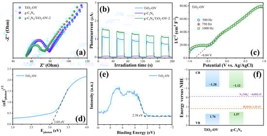 Furthermore, the flat-band potential (Efb) of the prepared TiO2-OV was investigated through the Mott–Schottky test. As can be seen in Figure 4c, the Efb of TiO2-OV is determined to be −0.84 V vs. Ag/AgCl, which corresponds to −0.62 V vs. NHE after conversion. The optical band gap (Eg) of TiO2-OV is calculated to be 3.04 eV according to the Tauc plot method (Figure 4d). Additionally, the bandgap between the valence band and the Fermi level of TiO2-OV is determined to be 2.38 V based on the XPS valence band spectrum (Figure 4e). Consequently, the valence band position (EVB) of TiO2-OV is calculated to be 1.76 V. Using the formula ECB = EVB − Eg, the conduction band position (ECB) of TiO2-OV can be calculated to be −1.28 V. Moreover, according to our previous study, the ECB and EVB potentials of g-C3N4 ultrathin nanosheets were about −1.12 and 1.57 eV, respectively []. The matched band structures of TiO2-OV and g-C3N4 materials facilitate the interfacial charge separation and transfer, thus enabling more excited electrons to participate in the adsorption and activation of N2 during the photocatalytic reduction reaction (N2/NH3 = −0.28 V vs. NHE).
