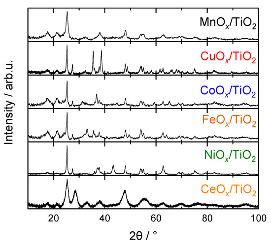 Multiple catalysts with MnOx, CuOx, CoOx, FeOx, NiOx and CeOx as the active component supported on TiO2 were synthesized and investigated for their catalytic activity for the NH3-SCR-DeNOx in a temperature range from 393 to 673 K. N2-sorption revealed a specific surface area of 45 m2 g−1 and an average pore width of 20.5 nm for the support. After impregnation with the active component, a comparable reduction of the specific surface by ~8 m2 g−1 and an average pore width of 22.5 nm was observed for the catalysts compared to the support. Differences between the catalysts was within the uncertainty of the measurement. Accordingly, comparable textural properties can be assumed for the investigated catalyst. The reduction in specific surface area and increase in average pore width can be explained by blockage of smaller pores of the support by the active component. XRD of the investigated catalysts are presented in Figure 1.