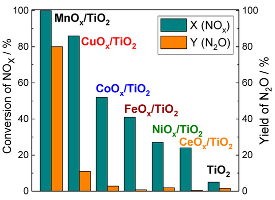 Conversion of NOx (left) and yield of N2O (right) during the NH3-SCR-DeNOx over TMO-containing catalysts (reaction conditions: see Section 3.3).