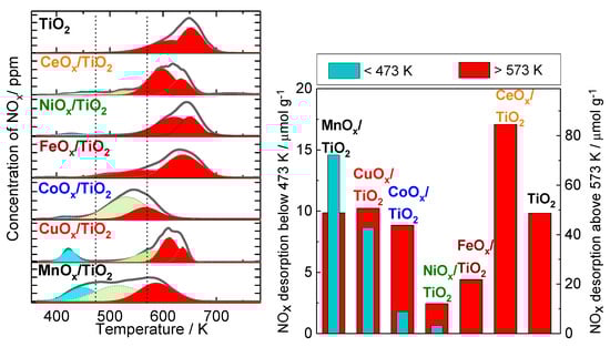 From the profiles of the desorbing NOx products depicted in Figure 8 (left), an obvious effect of the active component on the AN-decomposition is visible. For the TiO2 support, a broad desorption range of decomposition products starting at around 473 K was observed. Remarkably, this temperature range largely corresponds to the temperature range for AN-decomposition [52]. For MnOx/TiO2 and CuOx/TiO2, the investigated catalysts with the highest oxidation ability and simultaneously highest activity for the NOx-conversion during NH3-SCR-DeNOx, the initial decomposition temperature was significantly reduced to 400 K and 413 K, respectively. Contrary to the broad desorption of N2O, NO and NO2 from the TiO2 support, two different regions for the AN-decomposition were observed for both catalysts: one at lower temperatures, up to roughly 70 K higher than the initial decomposition temperature and a second one at higher temperature range between 500 and 620 K. The first region is characterized by a sharp peak of both N2O and NOx, indicating a fast decomposition already below or close to 473 K. This suggests that the active metal oxide catalyzes the AN-decomposition and decreases its thermal stability. In the second temperature range, a much broader desorption peak occurs consisting mainly of NO and NO2.