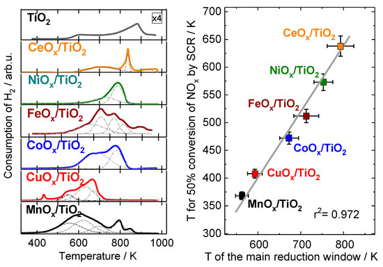As can be seen in Figure 9 (right), the correlation between the reduction temperature and temperature for NOx conversion of 50% is linear for the investigated catalysts, revealing a direct dependency of the NH3-SCR-DeNOx activity on the redox properties. As this correlation not only occurs for MnOx/TiO2 and CuOx/TiO2 in the low-temperature range for the NH3-SCR-DeNOx below 473 K but also at higher temperatures, this indicates that the observation is valid over the whole temperature range of potential NH3-SCR-DeNOx applications and that the redox properties of a catalyst are one of the main governing factors for NH3-SCR-DeNOx activity.
