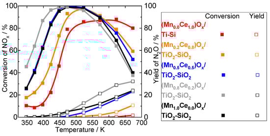 Among the catalysts prepared and investigated for the NH3-SCR-DeNOx reaction, MnOx/TiO2 showed the highest activity at low temperatures with low yield of N2. Contrary, CeOx/TiO2 as a counterpart catalyst showed lower NH3-SCR-DeNOx activity but the lowest yield of N2O. To verify the validity of the correlation between redox properties and NH3-SCR-DeNOx activity and to develop a more efficient low-temperature catalyst, a series of MnOx-CeOx mixed oxide catalysts supported on TiO2-SiO2 have been prepared as a combination of opposite ends of the activity-selectivity-range of the investigated catalysts. Furthermore, the TiO2 support was modified with the addition of 4.4 wt.-% SiO2 to improve the H2O and SO2 resistance of the catalysts [46,47]. The respective mono-oxidic catalysts, MnOx and CeOx, represent the investigated materials with the highest and lowest activity for low-temperature NH3-SCR-DeNOx, respectively, as well as the strongest and weakest redox properties. The total loading of the active component for each catalyst was kept constant and the molar ratio of MnOx to CeOx was varied. The conversion of NOx and yield of N2O during the NH3-SCR-DeNOx in a temperature range from 348 to 673 K is presented in Figure 10.