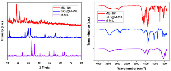 The X-ray diffraction (XRD) and FTIR spectra of patterns for MIL-101, M-MIL, and BiOI@M-MIL.
