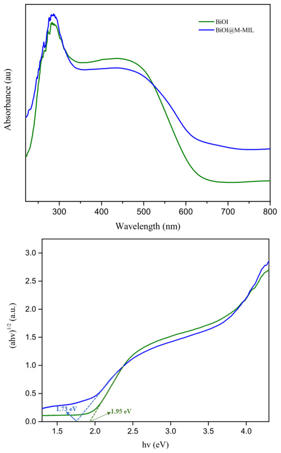 where hν, A, and Eg are energy, ratio constant, and band gap energy, respectively. n is considered as 2 or ½ for direct or indirect semiconductors, respectively. As shown in Figure 2, Ebg of BiOI and BiOI@M-MIL was calculated at 1.95 and 1.73 eV, respectively. This value was lower than that of BiOI semiconductor. This means that the electrons transport rapidly, and the pollutants degrade quickly [38].