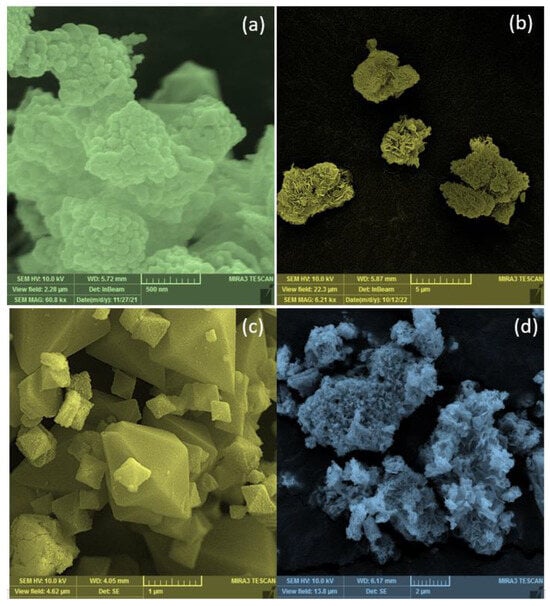 The morphology of MIL-101, M-MIL, BiOI, and BiOI@M-MIL photocatalysts using SEM images are presented in Figure 3a–d. Considering SEM images, M-MIL has an octahedral structure with a rough surface and distinct edges with a size of 1–2 μm, while BiOI possesses a sheet-like structure. Also, BiOI@M-MIL is composed of sheet structures with diameters of about 100–300 nm.
