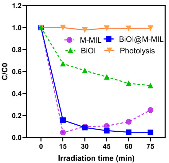 Screening tests were conducted to demonstrate that the integration of modified MIL into BiOI structure produces binary BiOI@M-MIL with enhanced adsorption and photocatalytic performance compared to pristine BiOI. Figure 4 compares the AR14 discoloration by the prepared materials, i.e., BiOI, MMIL, and BiOI@M-MIL. As seen, BiOI@M-MIL shows significant photocatalytic performance compared to pristine BiOI. After 75 min irradiation time, the dye discoloration for BiOI@M-MIL was 95.4%, which was 1.81 times more than 52.7 for BiOI. M-MIL exhibits significant dye removal efficiency, particularly during the initial mixing time. However, this performance diminishes over time, indicating that the dye is primarily adsorbed by M-MIL initially but subsequently desorbs. Figure 4 also shows the photolysis of the AR14, which is negligible (<1%) over 75 min of irradiation time.