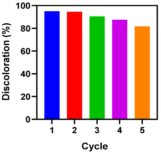 It is significant to study the photocatalytic activity of BiOI@M-MIL in successive use–reuse cycles to examine its stability and reusability. Hence, the reusability of BiOI@M-MIL was tested under optimized conditions. The results of composite efficiency against AR 14 in five cycles are shown in Figure 6. As seen, the discoloration efficiency decreased by 13.8% after five cycles, demonstrating the high recyclability of BiOI@M-MIL.