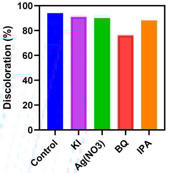 The main species involved in the photocatalytic discoloration of dye was identified using radical scavengers. Scavengers including KI (trapper for h+), IPA (trapper for ºOH), AgNO3 (trapper for e−), and BQ (trapper for ) were used to distinguish active species in the process. 2 mmol L−1 of scavengers was separately introduced into the reaction vessel containing AR14 dye. A sample without a scavenger was considered as a control. Finally, the effect of each scavenger on the AR14 removal was determined to determine the radical that mostly controls the discoloration performance.