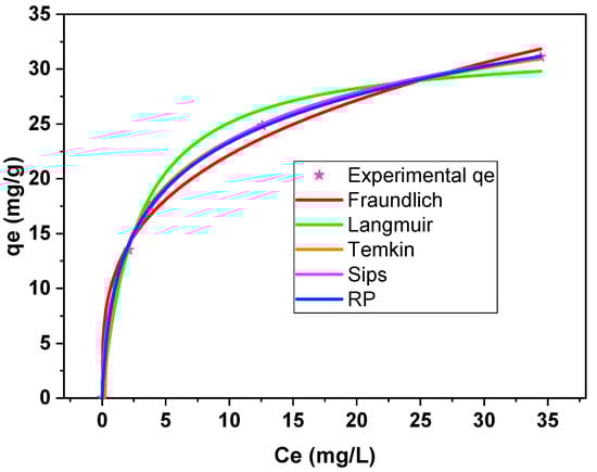 To understand the adsorptive behavior of BiOI@M-MIL for AR14, a series of experiments were conducted in the absence of light irradiation. After the adsorption was completed within 60 min, the equilibrium data were analyzed using different non-linear isotherm models to elucidate the adsorption capacities and characteristics.