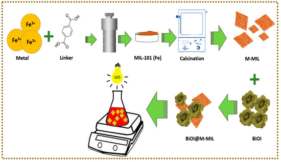 The materials used for the synthesis of MIL-101, BiOI, and the composite, as well as the synthesis protocols, are presented in the Supplementary Materials. The supporting documents also listed the instruments used for material characterization and the module of LED light irradiation. Figure 9 shows the schematic diagram for materials preparation and experimental study for dye removal.