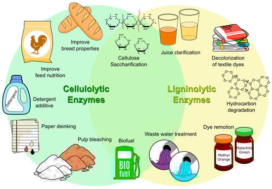 Enzymes are considered to be products of a biological nature with industrial applications that do not have a negative impact on the environment and have a wide range of industrial and bioprocessing applications [9]. On the one hand, cellulolytic enzymes consist mainly of cellulases (endoglucanases, exo-glucanases and β-glucosidases) and xylanases. These enzymes have diverse applications in sectors such as biofuels, food, feed, textiles, detergents, pharmaceuticals, and the paper industry [10,11]. The lignin peroxidases (LiP), manganese peroxidases (MnP), and laccases enzymes have applications in the textile industry, pulp delignification, animal feed, detergents, food, brewing, cosmetics, and for the removal of a wide range of industrial dyes [12].