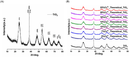 XRD pattern of (A) TiO2 nanorods and (B) Cr3+(doped)-TiO2 samples with different dopant concentrations. The labels indicate the theoretical ratio of Cr:TiO2 in the preparation of Cr3+(surface)-TiO2.