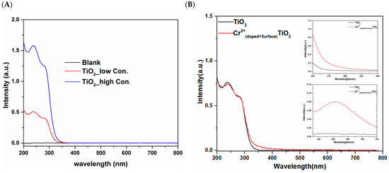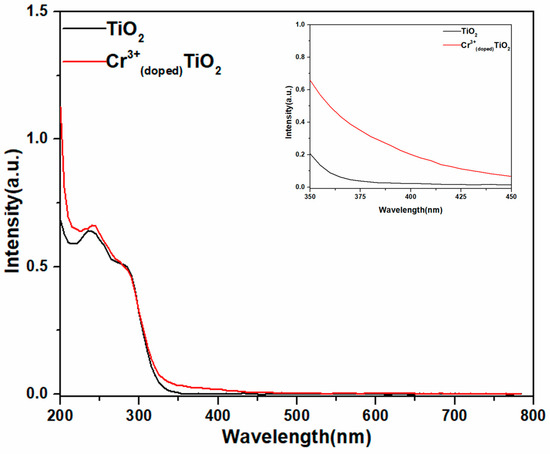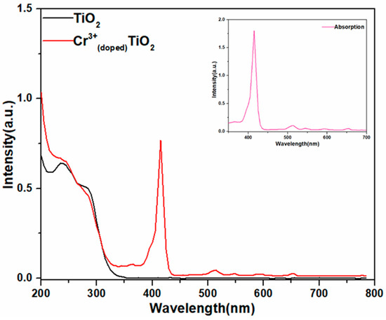 The UV-vis spectra of the Cr3+(doped)-TiO2 sample treated with tetraphenylporphyrin (TPP) are shown in Figure 8. The less concentrated Cr3+(doped)-TiO2 sample after TPP treatment shows unique features in the visible region. The absorption band close to 350–400 nm may originate from defects associated with oxygen vacancies.